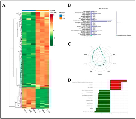 Figure 12C shows the quantitative distribution of odor categories and potential sensory contributions among differential metabolites in ginseng roots under LK and CK treatment conditions. The flavor profile revealed a primary sensory pattern dominated by sweet-type (34 compounds), fruity-type (27 compounds), and herbal-type (19 compounds) metabolites, accounting for 23.0%, 18.2%, and 12.8%, respectively. Classification by sensory attributes (Table S4) revealed that compared with the LN treatment group, the LK treatment group exhibited significantly enhanced herbal characteristics with a co-distribution of woody-type (16 compounds) and balsamic-type (14 compounds) metabolites. This suggests a woody–balsamic complex as a signature flavor trait of the LK treatment group. Key metabolites demonstrated pleiotropic regulation properties: 1-cyclohexene-1-carboxaldehyde, 4-(1-methylethenyl)- (spanning sweet, herbal, and minty categories), and pentyl propanoate (contributing to fruity and tropical notes). These compounds, widely distributed in terpenoid and ester metabolic pathways, indicate their hub-like function in the flavor network. Among floral-type metabolites (15 compounds), α-(trichloromethyl)benzyl acetate (an ester) shared 42.9% co-occurrence with balsamic-type metabolites, implying that phenylpropanoid biosynthesis may drive floral–balsamic synergy. Low-abundance categories (e.g., aldehydic and acetone) were predominantly governed by single metabolites.