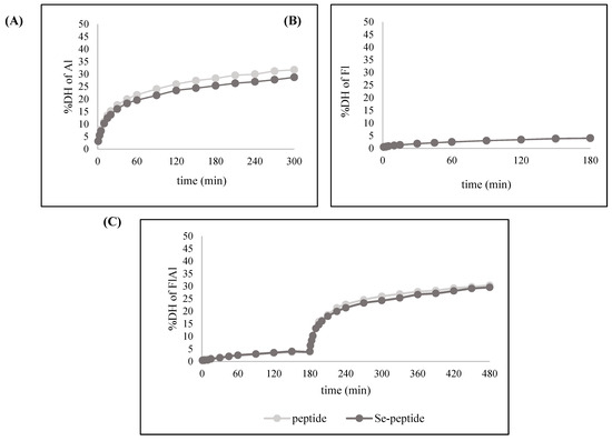 The Se-enriched perilla seed peptide from Se-containing germinated perilla seed, obtained using different proteases, is presented in Table 3. The protein contents of perilla peptides (PPs) derived from all enzymatic hydrolysates ranged from 61.20 to 68.08%, with no significant difference observed (p > 0.05). In contrast, the protein contents of perilla Se-peptides (PsePs) varied significantly depending on the enzyme used (p < 0.05), with values of 68.79 ± 0.31% for Fl, 62.79 ± 0.74% for Al, and 59.22 ± 1.25% for FlAl. Flavourzyme hydrolysates exhibited the highest Se content (1.69 ± 0.10 µg/g in PPs and 97.17 ± 0.69 µg/g in PsePs), while Alcalase and combination enzyme hydrolysates showed lower Se contents (1.50 ± 0.08 µg/g in PPs and 89.30 ± 0.74 µg/g in PsePs; 1.53 ± 0.06 µg/g in PPs and 84.60 ± 0.68 µg/g in PsePs, respectively), with significant differences (p < 0.05). The degree of hydrolysis (DH) values for the different enzymatic treatments (Figure 1) were as follows: Al showed DH values of 31.73 ± 0.39% in PPs and 28.75 ± 0.26% in PsePs. Fl resulted in significantly lower DH values of 3.87% in PPs and 4.04% in PsePs. The combination of Flavourzyme and Alcalase (FlAl) produced DH values of 30.39% in PPs and 29.58% in PsePs, comparable to those obtained with Alcalase alone. The results suggest a slight inhibition of hydrolysis by Se at higher concentrations in Al. The lower DH values observed with Fl are likely due to its exopeptidase activity, which limits extensive peptide bond cleavage. The similar DH values of Alcalase alone and the combined treatment indicate that Alcalase played the dominant role in hydrolysis. This may be attributed to its broad specificity, particularly its ability to cleave peptide bonds in serine (Ser) residue, which are abundant in perilla seed protein [5]. Similar results were observed in Se-enriched brown rice peptides, which, when hydrolyzed by Alcalase, exhibited the highest DH compared with Neutrase, flavorase, and papain [12]. In addition to serine, Alcalase can also cleave at Se-chelating amino acids, including Glu, Met, and Lys residues, when these amino acids are located the P1 position [12,50]. This broader substrate specificity contributes to the higher DH observed with Alcalase compared with Flavourzyme. Additionally, the DH of Se-enriched perilla seed peptides increased rapidly during the first 60 min immediately after adding Alcalase to the mixture, followed by a slower rise. This suggested that during the initial hour, the enzymes had maximum interaction with the protein, but as the substrate gradually decreased, the hydrolysis rate declined. Similar trends were observed in previous studies on the hydrolysis of pecan meals and wheat germ protein [51,52].