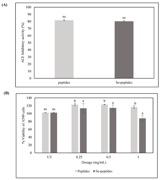 The ACE inhibitory and anticancer activities of Se-peptides ((A): ACE inhibitory activity; (B): % viability of A549 cells). Lowercase letters (a and b) correspond to the difference between samples in the same concentration; ns refers to not significant; UT, untreated.