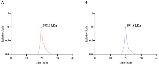 HPSEC-MALLS-RI (high-performance size-exclusion chromatography with multi-angle laser light scattering and refractive index detection) was used to determine the average molecular weights of NJPs and DNJPs. Each polysaccharide sample (10.0 mg) was dissolved in and brought to a final volume of 1.0 mL with [solvent], yielding a stock solution concentration of 10.0 mg·mL−1. All solutions were filtered through 0.22 μm sterilized membrane filters, and the filtrates were subsequently analyzed by high-performance liquid chromatography with size-exclusion chromatography. The chromatographic conditions were as follows: chromatographic column: OHpak SB-806 HQ 300 × 8 mm, OHpak SB-804 HQ 300 × 8 mm (7.9 mm × 300 mm, Shodex, Kyoto, Japan) in series; mobile phase: 0.2 M NaCl; flow rate: 1.0 mL·min−1; detector: (RID-G7162A) differential detector and DAWN detector (Wyatt Technology Co., Goleta, CA, USA); determination of weight-average molecular weight and number-average molecular weight (Mw and Mn) and polydispersity index (Mw/Mn). Data collection and calculation were performed using ASTRA 8 software. This method does not require the use of standards for comparison.
