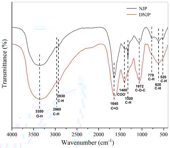 The NJPs and DNJPs were characterized by FT-IR, as shown in Figure 2. (The original data can be viewed in the attachment.) The FT-IR analysis of the polysaccharide reveals characteristic absorption bands corresponding to O-H stretching vibrations at 3350 cm−1 and C-H stretching vibrations at 2960 cm−1 and 2930 cm−1 [25]. The stretching vibration absorption peak of C=O is 1645 cm−1, and the carboxylic acid (COO-) symmetric vibration is 1400 cm−1 [26]. The C-H in-plane bending vibration of the sugar ring was observed at 1320 cm−1, and the C-O stretching vibration was observed at 1072 cm−1, indicating that the polysaccharide contained a C-O-C glycosidic bond [27], and the absorption peak of C-H out-of-plane bending vibration was observed at 770–520 cm−1 [28].