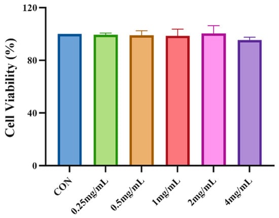 The CCK8 method was used to detect the viability of HepG2 cells following treatment with DNJPs. As shown in Figure 3, no significant decrease in cell viability was observed in DNJPs treated cells following 48 h of treatment compared with the normal control. The results indicated that HepG2 cells were not significantly toxic at 0.25–4.0 mg/mL DNJPs. Consequently, 0.5, 1.0, and 2.0 mg/mL DNJPs were used for subsequent experiments.