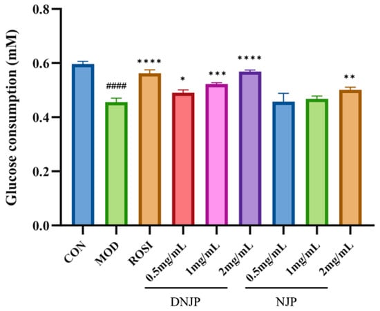 Effect of different doses of DNJPs and NJPs on glucose consumption capacity. Independent triplicate experiments yielded data (n = 3) as mean ± SD. Statistical significance (analyzed by GraphPad Prism 10) is marked as follows: * p < 0.05, ** p < 0.01, *** p < 0.001, **** p < 0.0001 (vs. MOD); #### p < 0.0001 (vs. CON).