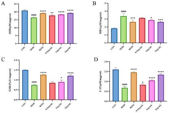 Effect of DNJPs on oxidative stress: (A) SOD; (B) MDA; (C) GSH-Px; (D) CAT. Independent triplicate experiments yielded data (n = 3) as mean ± SD. Statistical significance (analyzed by GraphPad Prism 10) is marked as follows: * p < 0.05, ** p < 0.01, *** p < 0.001, **** p < 0.0001 (vs. MOD); #### p < 0.0001 (vs. CON).