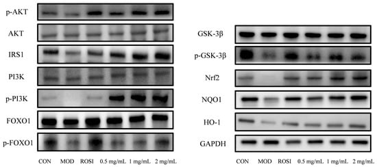 The experimental results show that compared with the normal control group (CON group), the protein expression levels of Nrf2, NQO1, HO-1, IRS1, p-PI3K/PI3K, p-GSK3β/GSK3β, p-AKT/AKT, and p-FOXO1/FOXO1 (the original data can be viewed in the attachment) in the high-glucose-induced glucose metabolism disorder model group (MOD group) were significantly inhibited (p < 0.05), while the positive control drug rosiglitazone (ROSI) group significantly reversed the negative regulatory effect of these proteins. At the same time, the low-, medium-, and high-dose DNJP administration groups could dose-dependently increase the expression of these key proteins (p < 0.05). Among them, the medium- and high-dose groups had particularly significant activation effects on the Nrf2 pathway proteins (Nrf2/NQO1/HO-1) and insulin signaling pathway proteins (IRS1/p-PI3K/p-GSK3β/p-AKT/p-FOXO1). The results indicate that DNJPs can significantly reverse the oxidative stress damage induced by high glucose and enhance insulin sensitivity through the synergistic activation of the Nrf2 antioxidant pathway and the PI3K/AKT/GSK3β/FOXO1 insulin signaling pathway (see Figure 6). This confirms that DNJPs can improve glucose metabolism disorders through a dual regulatory mechanism, and this mechanism is closely related to activating the cellular antioxidant defense system and restoring insulin signal transduction.