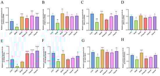 Relative protein expression levels: (A) Nrf2; (B) NQO1; (C) HO-1; (D) IRS1; (E) P-PI3K/PI3K; (F) P-GSK3β/GSK3β; (G) P-AKT/AKT; (H) P-FOXO1/FOXO1. Independent triplicate experiments yielded data (n = 3) as mean ± SD. Statistical significance (analyzed by GraphPad Prism 10) is marked as follows: * p < 0.05, ** p < 0.01, *** p < 0.001, **** p < 0.0001 (vs. MOD); # p < 0.05, ## p < 0.01, ### p < 0.001 (vs. CON).