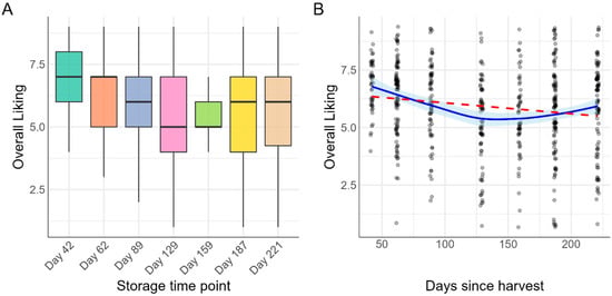 Change in consumer overall liking of ‘Annurca’ apples during post-melaio storage: (A) Boxplots showing the distribution of overall liking scores at seven discrete time points. The thick line represents the median score. (B) Scatterplot of all individual consumer ratings against storage time (days since harvest). The blue line represents a flexible LOESS regression model with a 95% confidence interval (shaded region), highlighting the non-linear trend in consumer preference.