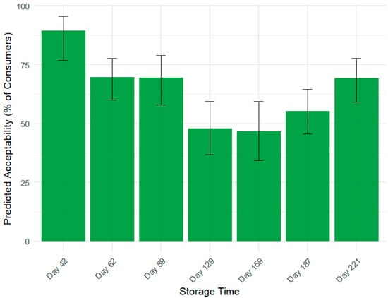 While the average liking score (Figure 1A) indicates the central tendency of consumer opinion, it can obscure crucial information about market risk. To address this, we conducted an acceptability analysis to determine the percentage of the consumer panel that found the product commercially viable, defined as a liking score of 6 or higher. This ‘headcount’ of satisfied consumers provides a more direct measure of market potential than the average rating alone. A binomial logistic regression model was used to robustly estimate the proportion of ‘accepters’ at each storage time point. The model confirmed a highly significant effect of storage time on Acceptability (χ2(6) = 30.6, p < 0.001). As visualized in Figure 2, the results reveal a dramatic U-shaped trajectory for the apple’s market potential. Initially, the apples showed high commercial promise, with nearly 90% of consumers finding them acceptable (Day 42). However, this proportion plummeted to a low of 47% by Day 159, representing a point of significant commercial risk where fewer than half of consumers would be satisfied. Crucially, in line with the trend in Overall Liking, Acceptability rebounded during the final two months of storage, recovering to 72% by Day 221. This analysis moves beyond a simple average to quantify the dynamic shifts in consumer consensus, demonstrating how the product’s viability in the market falls and subsequently recovers over its shelf life.