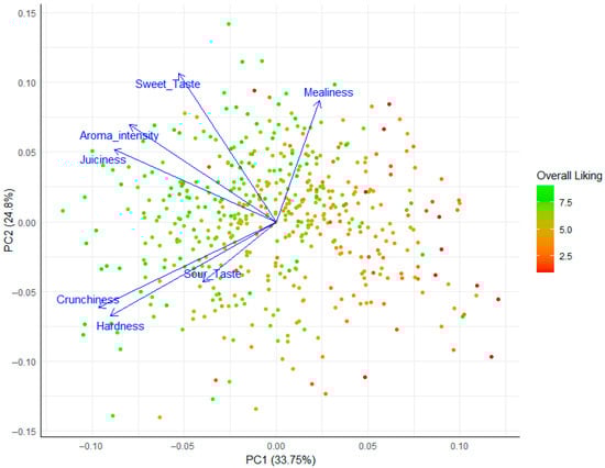 Principal Component Analysis (PCA) biplot of the seven sensory attributes. Individual consumer ratings are plotted as points and colored by the ‘Overall Liking’ score, from low (red) to high (green). The blue vectors represent the original sensory attributes, showing their direction and contribution to the first two principal components. The percentage of variance explained by each component is shown on the axis labels.