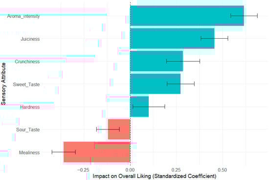 Key drivers of ‘Overall Liking’ for ‘Annurca’ apples. The plot displays the standardized regression coefficients (β) for each sensory attribute from a multiple linear regression model. The length of the bar indicates the strength of the impact on the liking score, while the error bars represent the standard error of the coefficient. Positive coefficients (blue) indicate positive drivers of liking, while negative coefficients (red) indicate negative drivers.