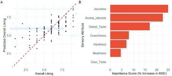 Random Forest model performance and variable importance: (A) Predicted versus actual ‘Overall Liking’ scores on the unseen test data. The dashed red line represents perfect prediction. (B) Variable importance plot ranking the sensory attributes based on the percentage increase in mean squared error (%IncMSE) when the variable’s values are randomly shuffled. Higher values indicate greater importance to the model’s predictive accuracy.