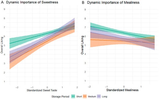 A significant interaction was found between Sweet Taste and storage time (β = 0.16, p = 0.034). As visualized in Figure 6A, the positive impact of Sweetness on Overall Liking becomes significantly stronger as storage progresses. For apples in the ‘Short Storage’ period, the relationship is moderately positive. However, for apples in the ‘Medium’ and ‘Long’ storage periods, the slope of the relationship steepens considerably. This indicates that while sweetness is always desirable, it becomes a more critical determinant of liking in apples stored for longer periods.
