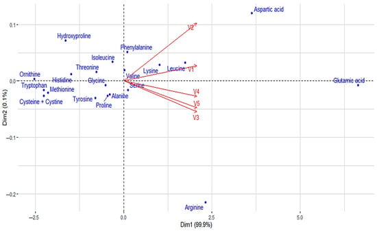 Principal component analysis (PCA) was used to visually represent and compare the amino acid profiles of five different pea protein beverages (V1–V5). The graph in Figure 1 plots both beverages (vectors) and amino acids (dots) based on their relative contributions to the first two principal components (Dim1 and Dim2), which together explain 99.9% and 10.1% of the variance in the data.