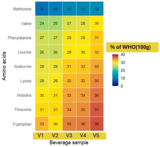The heat map (Figure 2) depicts the content of eight essential amino acids (valine, tryptophan, threonine, phenylalanine, methionine, lysine, leucine, and isoleucine) in five pea protein beverage samples compared to the WHO recommendations for adults (per 100 g of product). These recommendations are based on standards defined for an adult with a body weight of 70 kg [62].