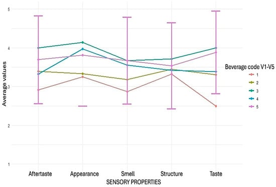 The sensory evaluation results revealed significant differences between the five developed pea protein beverages (V1–V5), which were evaluated in five attributes using a 5-point hedonic scale (1 = “very dislike”, 5 = “very like”). Overall, the highest ratings were obtained by the blueberry–vanilla flavoured beverage (V3) and the blackcurrant–apple flavoured beverage (V5), which were consistently rated higher than the other samples, especially in terms of taste and visual appearance (Figure 3).