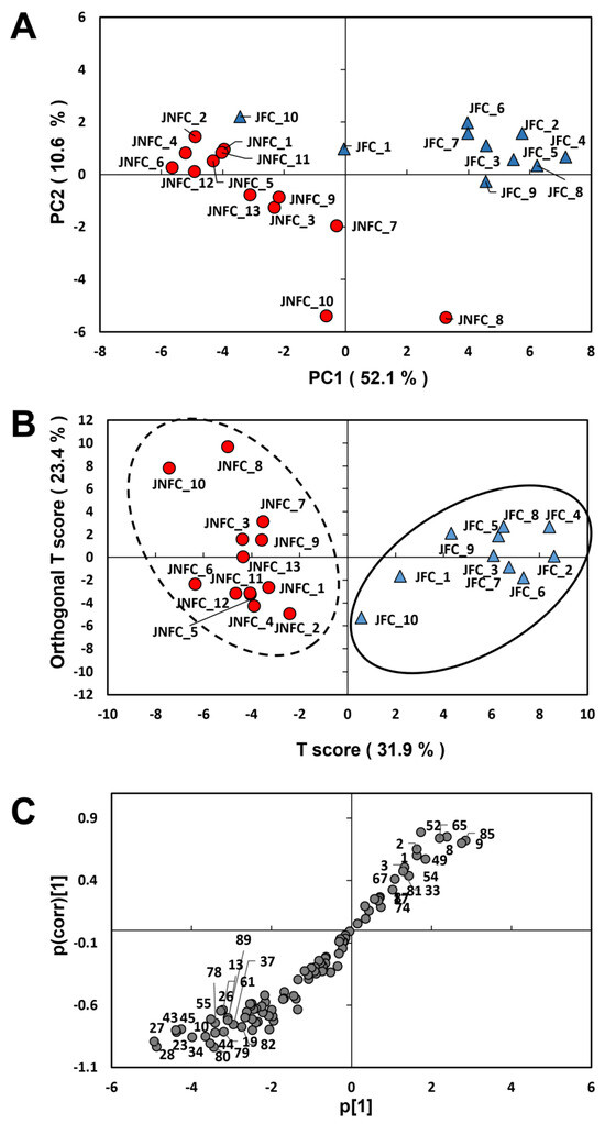 Multivariate analysis based on the VOC profiles of the tomato juices. (A) Score plot based on PCA analysis. Each number indicates samples in Table 1 (JNFC 1-13 and JFC 1-10). (B) Score plot based on OPLS-DA. Each number indicates the same as (A). (C) S-plot based on OPLS-DA. Each number indicates the detected VOCs, which are the same as those in Table 3.