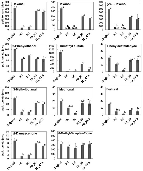 Quantitative comparison of the main aroma-active compounds in the tomato juices. Original, HC, DC, FD_50, and FD_ 87.5 indicate original juices (standard), reduced juice from concentrate by heat, decompression, and freeze drying (50% and 87.5% loss of water), respectively. The data are expressed as the mean ± standard error of the mean (N = 3). Different letters indicate significant differences (p < 0.05, Turkey’s HSD test).