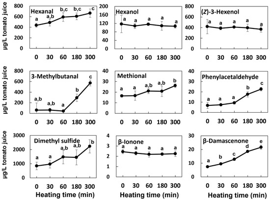 Thermal stability of the main aroma compounds in tomato juice incubated in boiling water. The data are expressed as the mean ± standard error of the mean (N = 3). Different letters indicate significant differences (p < 0.05, Turkey’s HSD test).