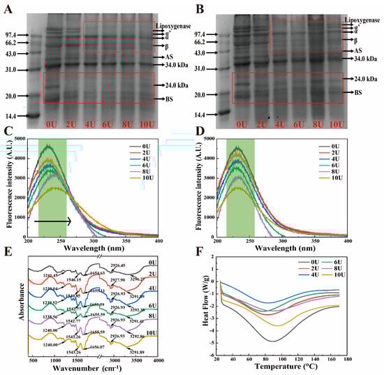 Urea-induced LP disassembly–reassembly structural changes. (A,B) SDS-PAGE before and after urea induction, (C,D) fluorescence spectra before and after urea induction, (E) FT-IR of reassembled LP, and (F) DSC after reassembly.