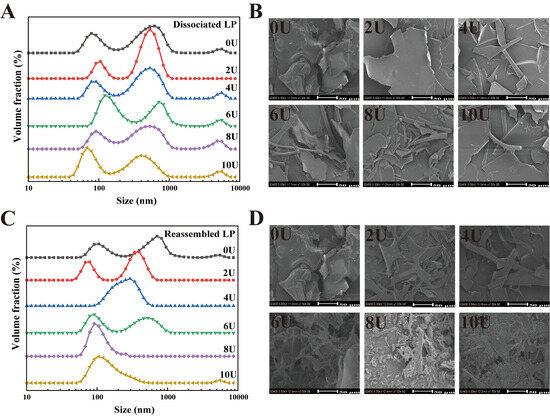 The particle size distribution (PSD) of the LP disassembly–reconstruction process at varying urea concentrations (0–10 M) was analyzed using DLS. As shown in Figure 2A, the PSD of untreated LP (0U) exhibited two major peaks centered at approximately 100 nm and 1000 nm, along with a minor peak at around 5 μm. This indicates that native LP undergoes different degrees of aggregation when solubilized in water. Upon the addition of urea, the PSD of urea-treated LP continued to show 2–3 peaks, with an overall increase in aggregation. SEM images (Figure 2B) reveal that as the urea concentration increased, the LP microstructure transformed from flaky or block-like formations to partially rod-shaped structures. Notably, at 8U, a distinct “structural fragmentation” was observed, which may further impact the functional properties of LP [39].