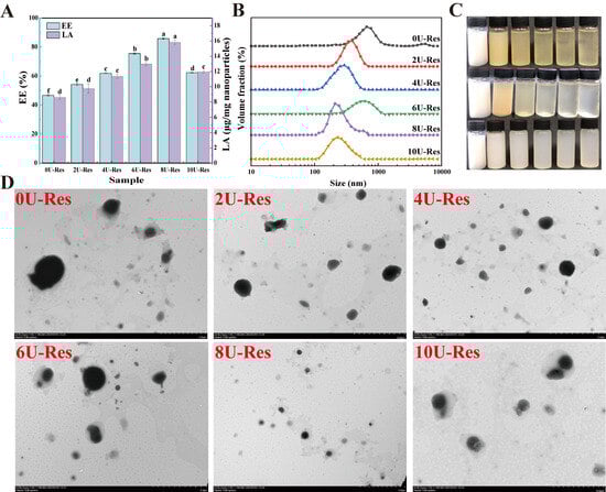 Basic characteristics of LP recombined and coated Res nanoparticles. (A) EE and LA, (B) particle size distribution, (C) solution images, from top to bottom: urea-induced LP disassembly process, recombined and coated Res; from left to right: 0U, 2U, 4U, 6U, 8U, and 10U, (D) transmission electron microscopy. Data with different superscripts in the same column indicate significant differences (p < 0.05).