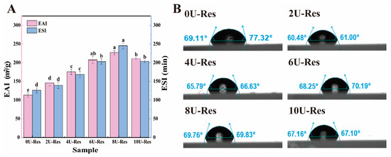 Oil–water interfacial properties of Res nanoparticles coated with LP after reconstitution. (A) EAI and ESI, (B) contact angle. Data with different superscripts in the same column indicate significant differences (p < 0.05).