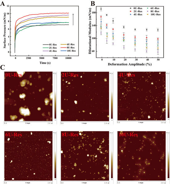 The surface activity of [U]-induced LP-Res nanoparticles was measured using a drop tensiometer (Figure 5A). The nanoparticles exhibited a rapid increase in surface pressure within the first few seconds, which continued to rise to 6.5–10.3 mN/m after 3 h of adsorption, demonstrating a strong dependence on [U]. The encapsulation of Res by LP under urea treatment led to an overall increase in surface pressure throughout the entire adsorption period, with 8U-Res showing the highest value. This enhancement in surface activity is likely due to the reversible disassembly and reassembly of LP induced by urea, which may facilitate the co-adsorption of both LP and Res at the air–water interface [51].