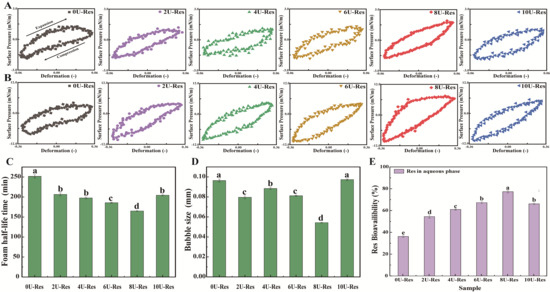 Lissajous plots illustrating the relationship between surface pressure and interfacial deformation of nanoparticle-stabilized air–water films under oscillatory conditions at (A) 5% and (B) 30% strain amplitudes. Foam stability of reconstituted LP-encapsulated Res nanoparticles: (C) foam half-life and (D) average foam size. (E) In vitro digestibility of Res-loaded nanoparticles.Data with different superscripts in the same column indicate significant differences (p < 0.05).
