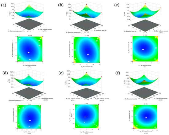 Three-dimensional response surface and corresponding contour plots illustrating the interaction effects of experimental factors on the PDI value (Y), with other variables held at their central levels. (a) Interaction between Vc concentration (X1) and GSE concentration (X2); (b) interaction between Vc concentration (X1) and reaction time (X3); (c) interaction between Vc concentration (X1) and reaction temperature (X4); (d) interaction between GSE concentration (X2) and reaction time (X3); (e) interaction between GSE concentration (X2) and reaction temperature (X4); (f) interaction between reaction time (X3) and reaction temperature (X4).