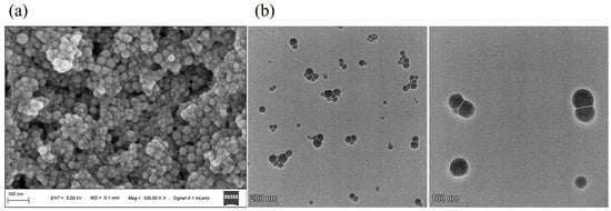 SEM was used to examine the morphology of GSE-SeNPs. At high magnification, the size of the nanoparticles was more clearly visible, appearing approximately spherical with smooth surfaces (Figure 2b). At low magnification, the overall distribution of the nanoparticles could be observed, showing uniform particle size with no obvious aggregation. The analysis results of the SEM images were consistent with the particle size distribution curve. TEM observations revealed that GSE-SeNPs were spherical in shape, uniformly dispersed in solution with no obvious aggregation. These microstructural observations are consistent with the particle size distribution and PDI values in the DLS results, further confirming the uniformity and stability of the nanoparticles. Similar observations were reported for Usnea longissima polysaccharide-modified SeNPs, where structural stability was attributed to non-covalent interactions (CO⋯Se or OH⋯Se) [25]. Collectively, GSE-SeNPs exhibit controllable particle size and consistent morphology, making them suitable for constructing functional food nanocarriers.