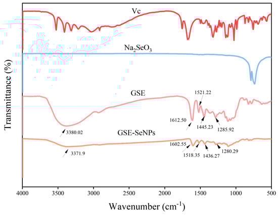 FT-IR spectra of GSE, Vc, Na2SeO3, and GSE-SeNPs.