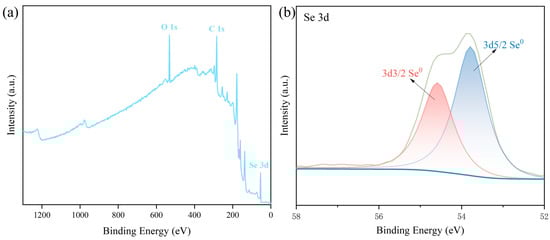 XPS Spectra of GSE-SeNPs. (a) Survey spectrum showing the presence of C, O, and Se elements; (b) high-resolution spectrum of Se 3d region.