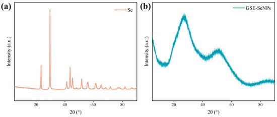 XRD analysis was conducted to reveal the crystal structure characteristics of GSE-SeNPs and their interaction with GSE (Figure 5). Elemental Se exhibits characteristic diffraction peaks at 23.54° and 29.84° (Figure 5a), indicating the presence of crystalline Se [34]. However, the diffraction peak at 29.84° disappears for GSE-SeNPs, and the peak at 23.54° weakens and broadens (Figure 5b), suggesting that GSE binds with SeNPs to form an amorphous crystal. This may be because polyphenol molecules act as a framework, decorating the surface of SeNPs and disrupting the crystal structure, leading to the formation of an amorphous solid. The same conclusion was found in a previous study where blueberry pomace polyphenols were used as a soft template to prepare nano-selenium [31]. Similar observations of diminished or absent diffraction peaks in SeNPs synthesized using Carica papaya extract and Penicillium chrysogenum have been attributed to the negative charge of flavonoids and phenolic compounds in the extracts [35,36]. Polar groups in GSE may disrupt the ordered arrangement of Se atoms through hydrogen bonding, electrostatic, or complexation interactions [37]. Combined with the FT-IR peak redshift, C/O element coating in EDS, and single Se0 valence state in XPS from this study, these results further confirm that GSE acts as both a reducing agent and stabilizer in SeNP synthesis. GSE-SeNPs primarily exhibit an amorphous structure. The negatively charged extract chelation provides enhanced uniformity, stability, and colloidal dispersibility to the nanoparticles, highlighting their potential applications in functional foods and bioactive materials.
