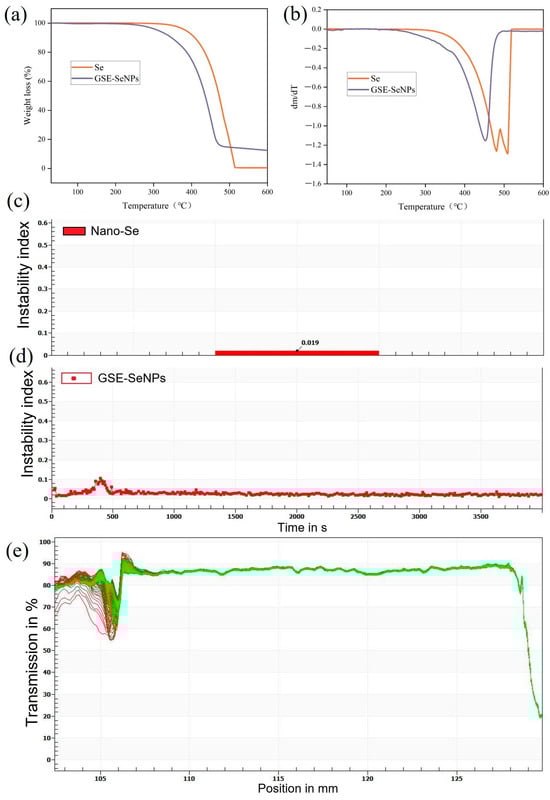 Thermal and centrifugal stability analysis of GSE-SeNPs. (a) TGA curves of GSE-SeNPs and Se; (b) corresponding DTG (first derivative) curves; (c) instability index value of GSE–SeNPs obtained from centrifugal analysis; (d) instability index curve showing temporal changes during centrifugation; (e) light transmission curve during centrifugation.