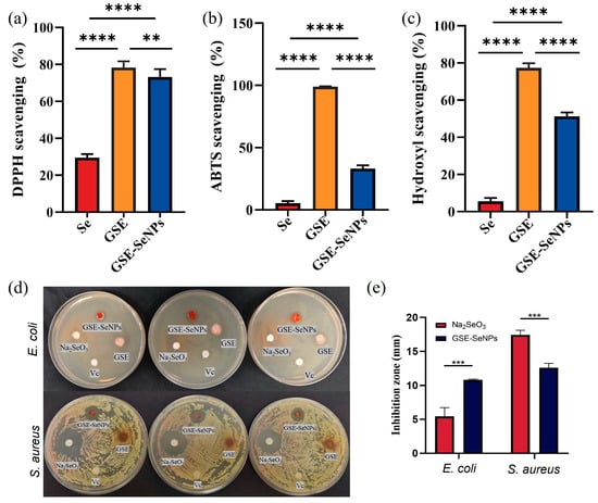 Antioxidant and antibacterial evaluation of GSE-SeNPs. (a) DPPH scavenging activity; (b) ABTS scavenging activity; (c) •OH radical scavenging activity; (d) inhibition zones against E. coli and S. aureus for different treatments; (e) inhibition zones of E. coli and S. aureus treated with Na2SeO3, GSE–SeNPs, GSE, and Vc. The asterisks indicate statistical significance of differences, with **, ***, and **** representing p < 0.05, p < 0.01, and p < 0.001, respectively.