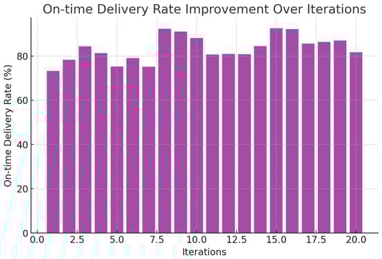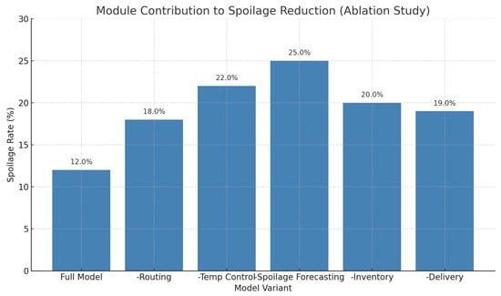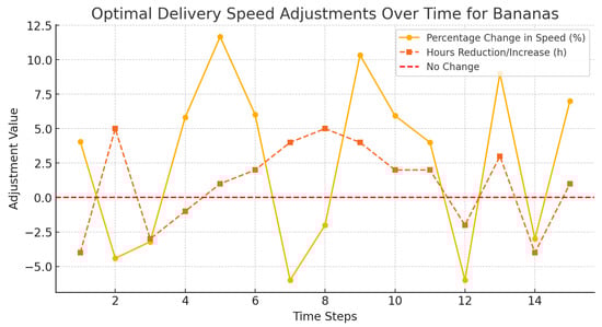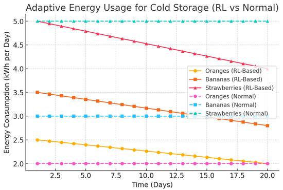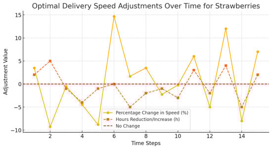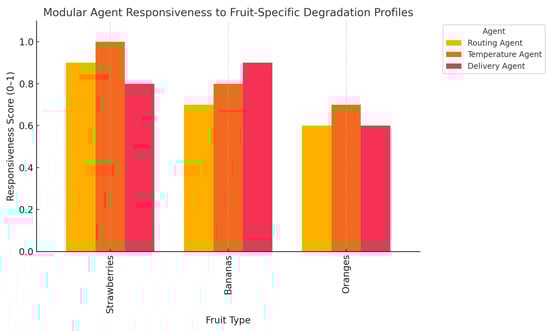 The bar chart provided in Figure 36 shows how adjustments were made by modular agents (routing, temperature, and delivery) in the reaction to various degradation sensitivities of chosen fruits. As an example, the temperature agent has the most acute sensitivities to strawberries, and, as a result, strict regulatory changes are required.