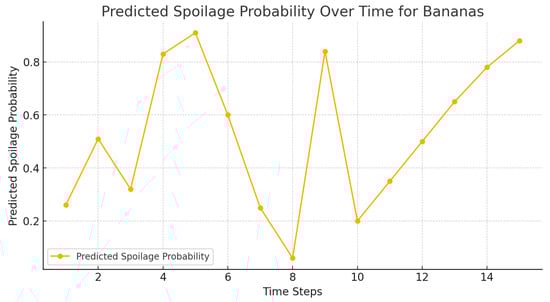 The calculated probability of spoilage of the oranges, strawberries, and bananas is presented in Figure 13, Figure 14 and Figure 15, respectively, where the amount is lower in agent-based systems than in benchmarks.