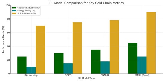 Agents in such systems have different, heterogeneous, roles, which include routing, refrigeration control, spoilage prediction, and inventory planning in complex, multi-agent systems like perishable food cold chains. In order to support this diversity, we offer a hybrid heterogeneous design policy, whereby each agent adopts a domain-specific learning structure that corresponds to its functional purpose, horizons in decision-making, act space, and frame obstacles. Unlike the historical homogeneous agent systems where the policy structures are assumed to be the same in all the entities, our system adjusts individual entity policy structures to reflect individual operating properties of the entity. As an example, the route optimization agent has a discrete action space and is learning using Q-learning that has to select an optimal next hop in a transportation network. Comparatively, the temperature control agent chooses a continuous action space by manipulating setpoints of refrigeration through a policy using DDPG. By using graph-structured data that can be used, containing the supply chain checkpoints, the spoilage prediction agent combines a graph-neural-network encoder with an actor–critic reinforcement learning system to adjust the risk thresholds in real time. Agents of inventory management operate within the asymmetric information conditions and employ actor–critic models to decide on the order during the demand uncertainty, local perishability, and sustainability limit, which is possible due to partial observability at warehouse nodes, distribution centers, and retailer shelves. The heterogeneous design in addition to the relationship between the complexity of the model to the structure of the tasks makes it realistic and deployable. Since training each agent requires a different observation and action specification, the framework is modular with the possibility of adding more types of agents in future deployment, e.g., recycling optimizers or demand-side controllers. The different agents are coordinated so that they have different architectures and have decentralized execution that has centralized training so that the agents can learn to behave in common goals and act independent of each other. Single reward functions such as Pareto-weighted penalties calculated based on amount of spoilage, time of delivery, and amount of carbon emission ensure coordination among the agents. On the whole, the hybrid heterogeneous policy design renders flexibility and the optimality of a specific task and generalization even in real-world, dynamic environments of cold chains.