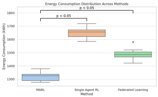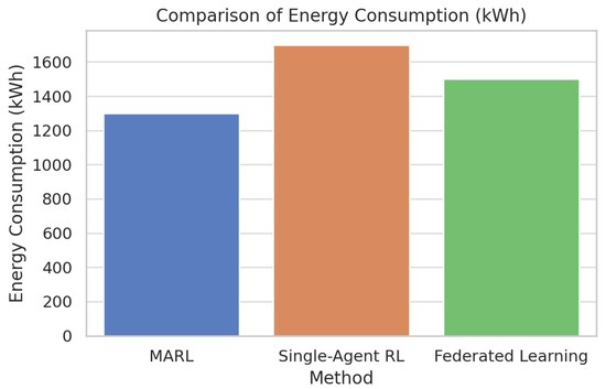 In Figure 40, there is an immense positive correlation between carbon emission and energy consumption, an indication that inefficiencies of the system have environmental consequences. Each dot represents an observation (data point). It shows the actual measured pair of values for energy consumption and carbon emissions. The red line is the line of best fit. It represents the trend relationship between the two variables. The red line slopes upward, which means that as energy consumption increases, carbon emissions also increase. In combination, the figures reveal that MARL is stronger in conserving food quality, reducing operational transgressions, and enhancing energy gathering, which altogether result in the low ecological imprint.