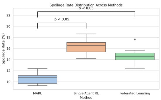 In this section, we examine the proposed idea of integrating MARL with blockchain for more sustainable management of the cold-chain logistics process. The system simulates the fruit supply chain by using data that imitates the features of real-world supply chain situations, including traffic pattern changes, different weather conditions, the nature of perishable goods, and use of energy. Spoilage percentage, refrigerator energy use, delivery schedule, consistency in stock, and reductions in carbon emission are examples of key performance indicators. Training for these agents happened in similar ways as in real life, and they were evaluated by themselves as well as with a team of other agents. Thanks to the CTDE concept, agents could respond to different situations and contribute to the system’s better performance. Also, the blockchain was reviewed to check if it allowed for secure data, automated rules by using smart contracts, and held all parties accountable. The analyses support the concept that our framework is much better than logistics methods that do not use AI or secure data sharing. Among other achievements, we mention up to 50% less spoiled strawberries, reduced energy use, and higher accuracy in organizing fruit shipments. Moreover, we study how each module affects the final results and compare our model with renowned and standard approaches. Overall, these findings prove that our method for cold-chain logistics is both effective, practical, and sustainable. The given work offers an empirical evaluation of a multi-agent reinforcement learning framework tailored towards cold-chain logistics across the provided figures that shed light on the performance of the given framework and its associated benefits.