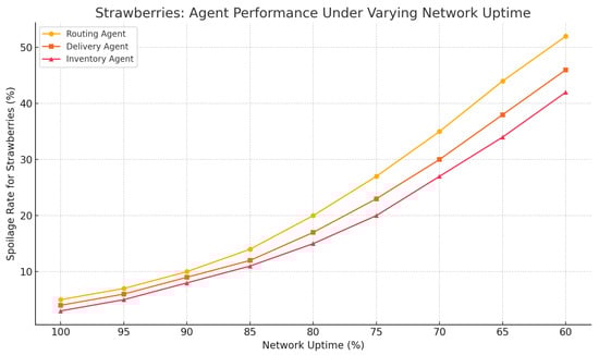 Figure 37 is an empirical evaluation of the effect of network uptime, which is reduced, from 100 to 60%, on the rate of spoilage in strawberry cold-chain logistics. The results indicate a significant increase in spoilage with the decreased reliability, and statistics show significant deterioration in all the types of agents.