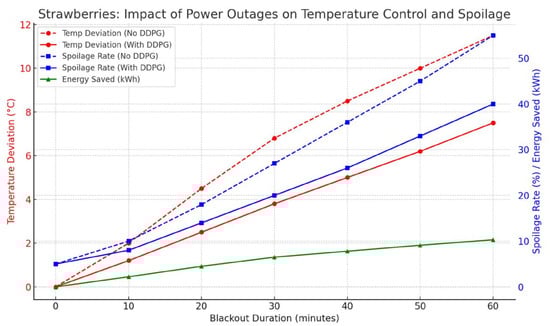 The interaction between the blackout time, spoilage, temperature deviation, and energy saving is made, as examined in Figure 38. In the absence of an adaptive regulation of the temperature of the meat using the DDPG-based system, the temperature excursion increases exponentially rising by more than 11 degree celcius within 60 min of the outage and spoilage reaching over 50% after 240 min of outage. Comparatively, in the deployment of DDPG agents, there are considerably reduced levels of temperature fluctuation, hence keeping spoilage below 2%.