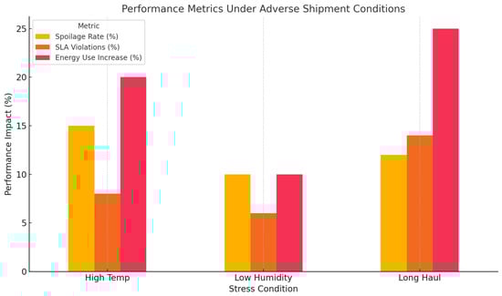 Figure 39, in its turn, presents a grouped bar chart breaking down the key performance indicators, namely, pasteurization, out-of-control service-level agreement (SLA), and the proportional increases in energy use sorted out across three stress scenarios, i.e., high temperatures, low humidity, and prolonged transportation periods. The visualization consequently highlights the issues of operation of the system as well as the trade-offs in the system performance when it is subjected to adverse environmental conditions.