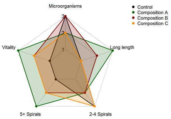 | Composition C | 10 | 6.90 ± 0.06 | 42.50 ± 0.55 | 22.90 ± 0.52 | 1.55 ± 0.18 | 19.50 ± 0.30 |
