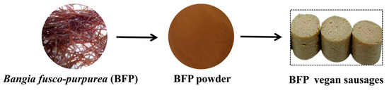The rising demand for animal meat has led to challenges such as greenhouse gas emissions and human health risks [1]. Plant-based meat analogs, manufactured from extracted plant proteins through extrusion, 3D printing, or mixing technologies, have gained significant attention as sustainable substitutes for animal meat [2]. This prominence stems not only from their texture and taste mimicry capabilities, but also from their reduced environmental footprint and alignment with ethical consumption trends [3]. However, conventional plant-based meats, primarily based on soy or wheat proteins, face nutritional limitations due to their singular composition and often lack essential nutrients such as iron and vitamin B12. Bangia fusco-purpurea (BFP), a high-value red seaweed rich in polysaccharides, dietary fiber, proteins, and natural pigments (e.g., phycoerythrin), offers both nutritional enhancement and functional benefits, and shows great potential for food applications [4,5,6]. Preliminary studies have confirmed that the BFP protein is abundant in essential amino acids and can offset the methionine and lysine deficiencies in cereal proteins when used in plant-based meat products [7]. In addition, its dietary fiber and trace elements (e.g., Fe, Zn, and Ca) provide natural nutritional advantages.