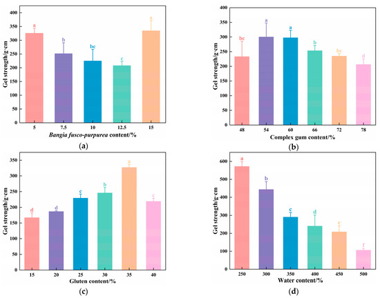 Effects of (a) BFP; (b) CG; (c) gluten; (d) water on the gel strength of BFP vegan sausages. Different letters indicate significant differences (p < 0.05).