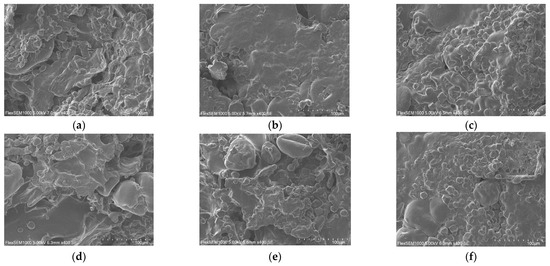 Effects of different addition rates of CG and gluten on the microstructure of BFP vegan sausage. Notes: (a), (b), and (c) represent 52%, 54%, and 56% CG, respectively, and (d), (e), and (f) represent 33%, 35%, and 37% gluten, respectively.