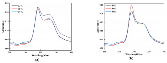 UV-visible absorption spectroscopy reflects protein structural changes and protein–small molecule interactions in samples. Previews studies have elucidated that the interaction strength affects the peak intensity changes, whereas peak shifts indicate microenvironmental alterations around the chromophores due to these interactions [37]. As shown in Figure 4, the absorption intensities varied among the vegan sausages with different gluten and CG contents; however, their spectral shapes, peak emergence points, and peak positions remained similar. All groups exhibited absorption peaks at 290 cm−1 and 330 cm−1. The absorption peaks between 250 and 290 cm−1 were attributed to the benzene ring structures of phenylalanine, tyrosine, and tryptophan in proteins, whereas the peak at 330 cm−1 was speculated to originate from the oil phase in vegan sausages. In Figure 4a, the intensities of the UV-visible absorption peaks decreased with increasing gluten content. The absorption peaks of the 35% and 37% gluten groups were similar, indicating that a higher gluten powder content promoted crosslinking protein in the samples, leading to the embedding of some hydrophobic bonds in the aromatic heterocycles responsible for the absorption peaks, thus reducing the peak intensity. This phenomenon is linked to structural alterations in the protein. Protein cross-linking can alter secondary structure, modifying the microenvironment of aromatic amino acid residues and consequently affecting their absorbance at specific wavelengths. Furthermore, cross-linking may change protein conformation, leading to either exposure or burial of hydrophobic regions, thereby influencing their physicochemical properties. Figure 4b illustrates that as the CG content increased, the UV-visible absorption peak intensity first increased and then decreased. The 54% CG group exhibited the highest absorption peak intensity, whereas the 52% and 56% CG groups showed similar peaks. This may be attributed to CG altering the polar environment of the sample, causing the molecular chains to unfold and exposing more hydrophobic groups in the aromatic heterocycles, thus increasing the absorption intensity. However, excessive CG introduces steric hindrance, embedding some proteins and resulting in reduced peak intensity [26].