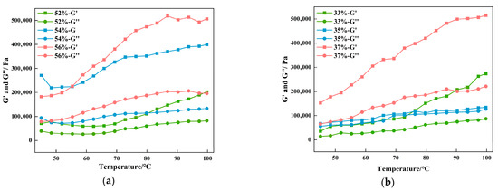 The G′ and G″ of the CG (Figure 5a) and gluten groups (Figure 5b) both exhibited an upward trend as the temperature rose. G′ was significantly higher than G″ throughout the process without any intersection, indicating that the vegan sausages, regardless of their CG and gluten content, demonstrated significant elastic characteristics, with the elastic modulus remaining dominant. During heating, the rate of protein gel formation increases, along with enhanced crosslinking of protein polymers, leading to the development of a network structure [38]. The 56% CG and 37% gluten groups established the steepest curve slopes, indicating the highest gelation rates, shortest time required to reach stability, and ultimately the highest gel strength. In general, gluten forms a stable gel network through strong intermolecular forces, whereas CG, despite its relatively weak intermolecular interactions, has a higher water-binding capacity, enabling it to form a gel network structure [39,40].