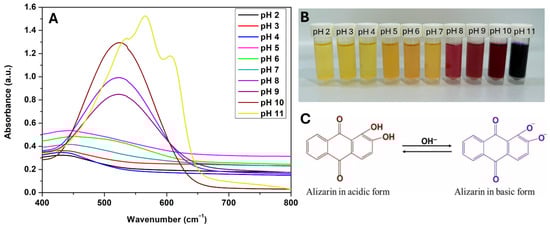 UV–vis absorption spectra of alizarin at pH 2–11 (A); visible color changes of alizarin solution at pH 2–11 (B); structural transformations of alizarin associated with color changes at different pH values (C).